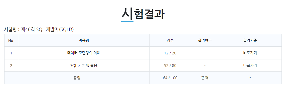 SQLD는 두 개의 과목으로 구성되어있고, 필기 50문항(단답형은 대략 10문제, 그 외 객관식 4지선다)을 풀면 된다.