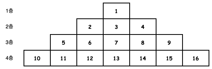 - i번째 층의 가장 오른쪽 블록은 i+1번째 층의 가장 왼쪽 블록보다 1만큼 크다.