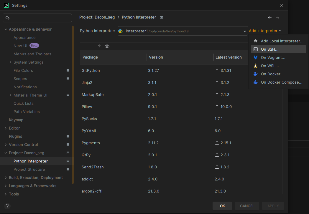Ctrl+Alt+S를 눌러서 설정창을 띄우고, Python Interpreter를 찾고, Add Interpreter에서 SSH를 선택한다.