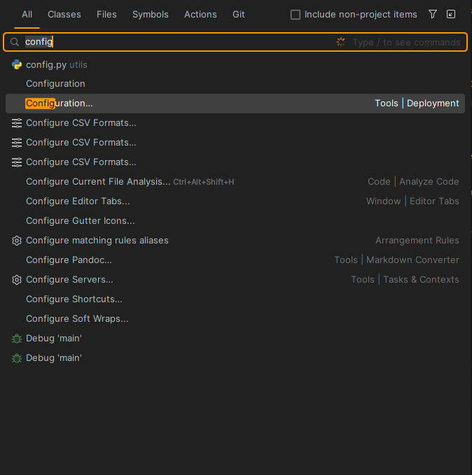 shift 두 번 연타하면 검색 창이 뜨는데, 아래의 그림처럼 Tools | Deployment에 해당하는 configuration을 들어가자.