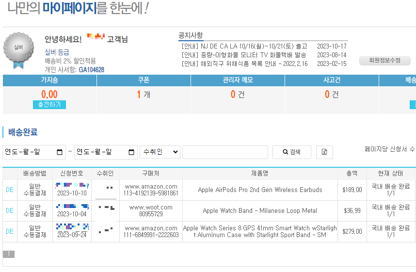 무려 한 달 사이에 세 번이나 배대지를 이용한 모습이다.