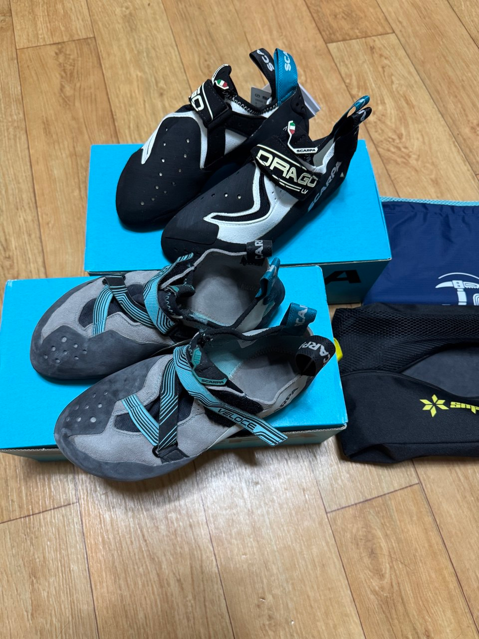 - Scarpa Drago LV: 39 ½ (두 번째 암벽화, 체중 실으면 신발 던지고 싶은데 너무 타이트해서 벗을 수도 없음)